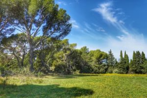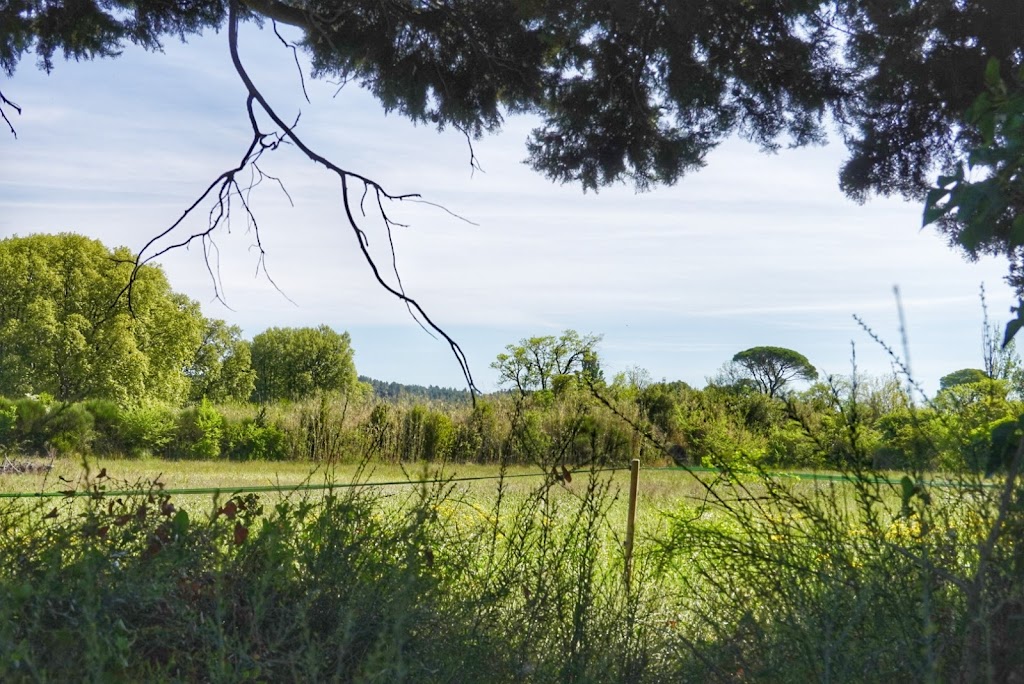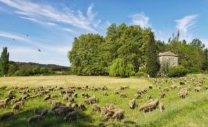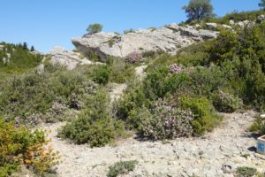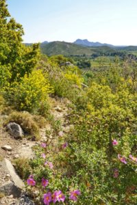 Dann hinab und über bequeme Schotterstraßen vorbei an diversen Mas und schönen Blumenwiesen Richtung Feuerwachturm Vigie de Longjean.