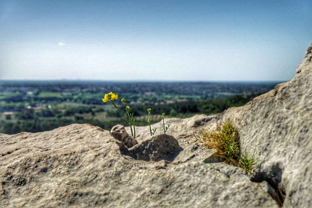 Unterhalb der Felsen laufen wir zum gallischen Oppidum, von dem man noch ein paar Mauern sehen kann. An der Felswand nebenan wird geklettert.