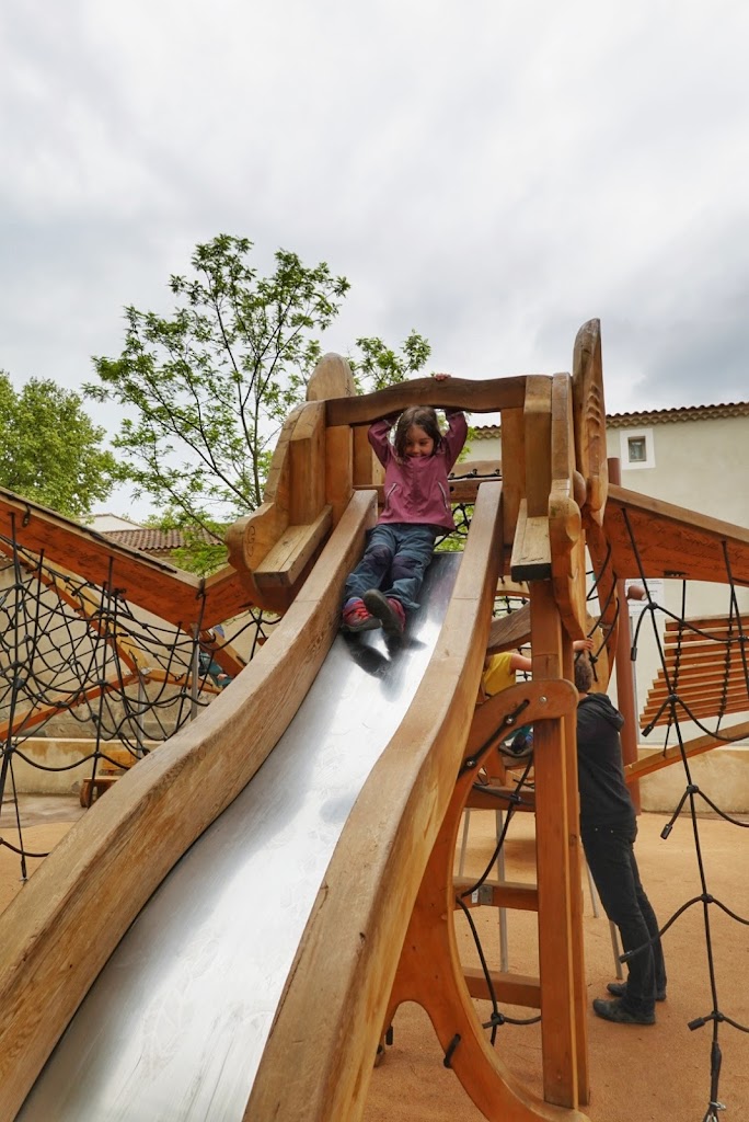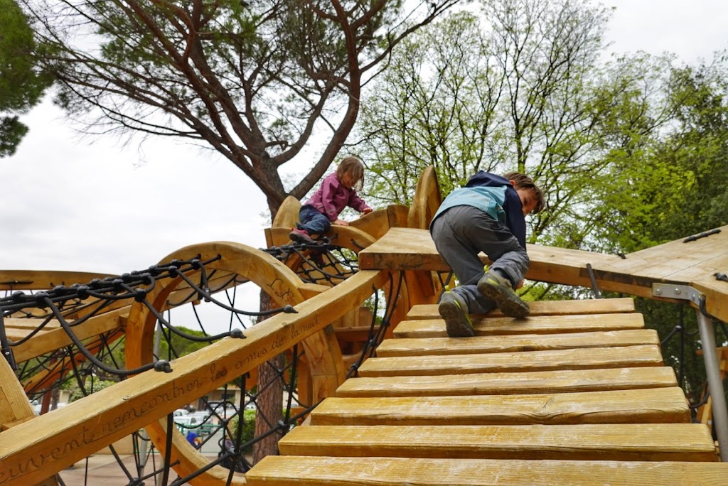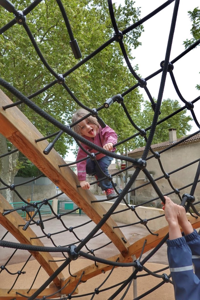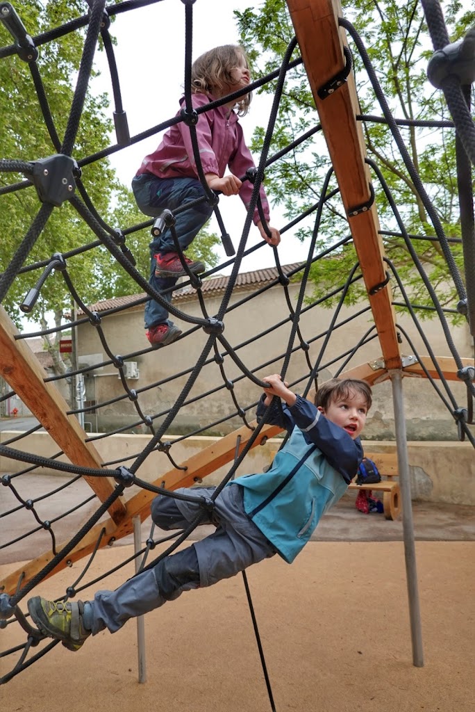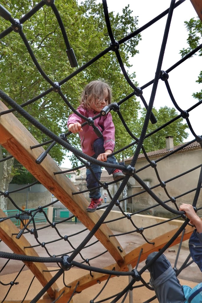 Bevor es wieder regnet, fahren wir nach St. Remy. Dort entdecken wir einen sehr schönen Spielplatz, der Mios und Avas Kletterkünste endlich mal herausfordert.
