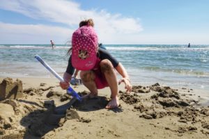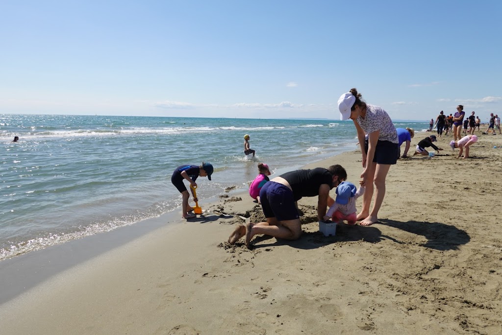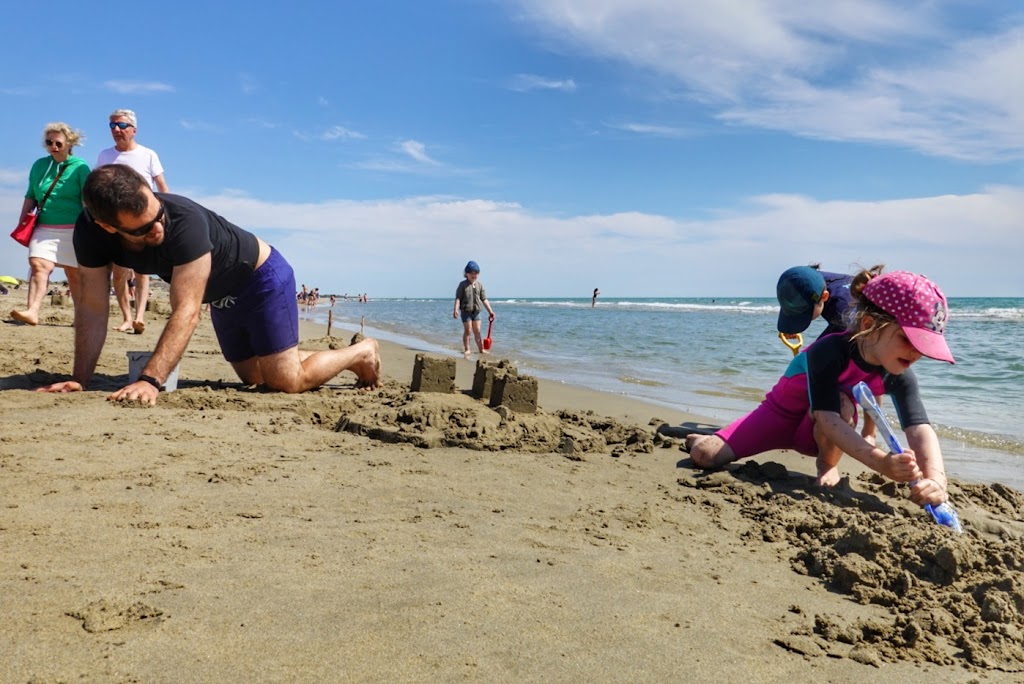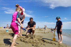 Eine große Sandburg wird gebaut, Kanäle werden angelegt. Danach noch die Dünen runterrollen und -springen.