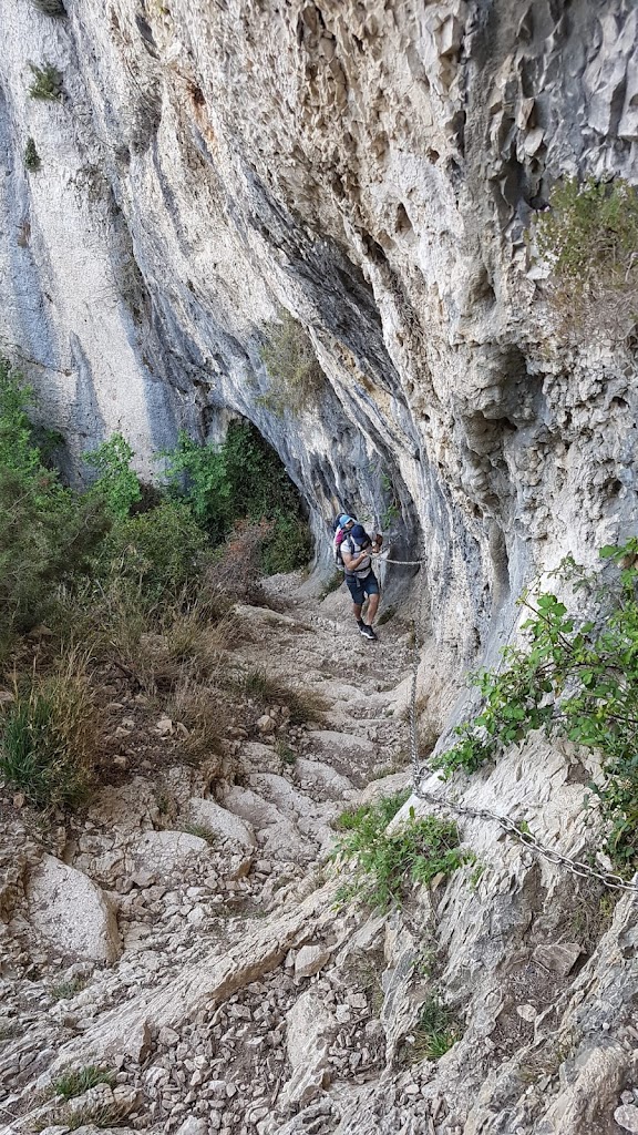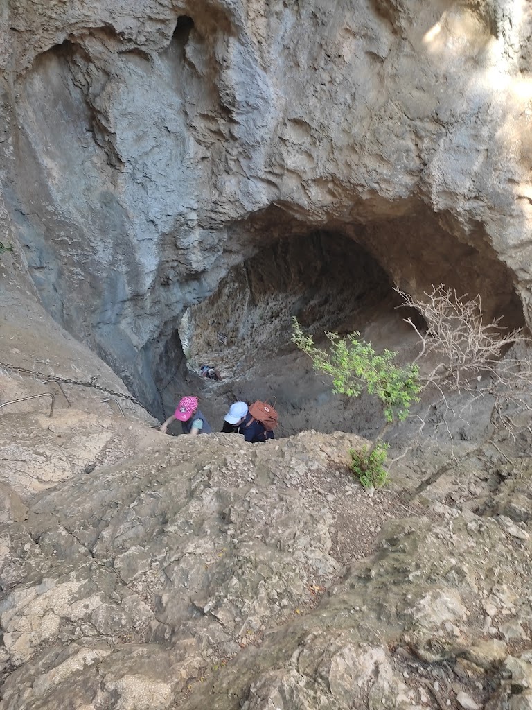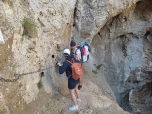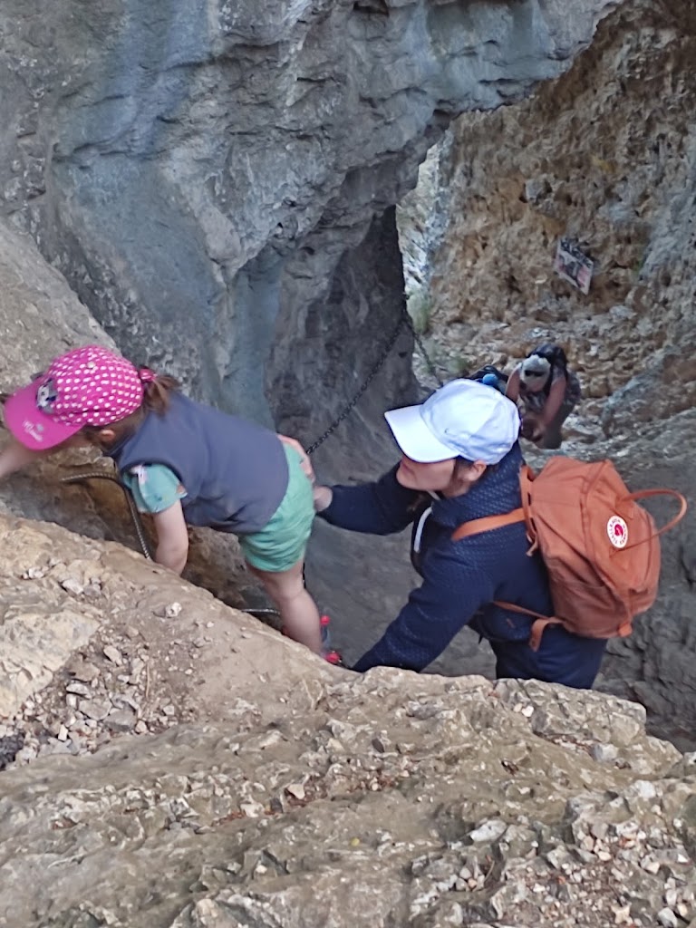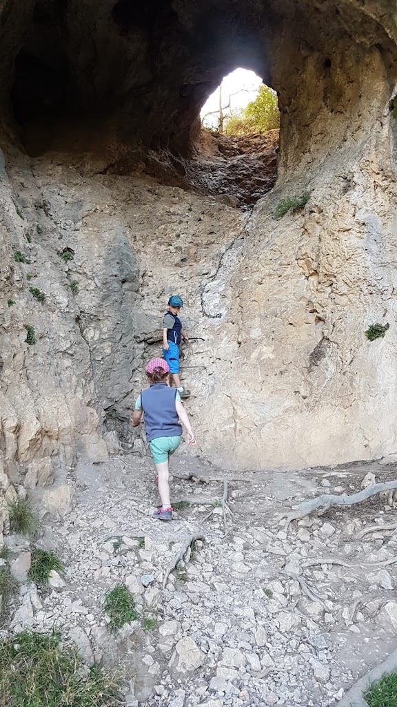 An einer kettengesicherten Passage geht es hinauf in eine große Felsenhalle. Wir lassen den Gegenverkehr vorbei und machen uns dann an den Aufstieg. Über Felsklammern und an Ketten entlang geht’s ca. 25m hinauf. Ein Erwachsener immer hinter einem Kind, klappt gut. Oma schimpft zwar den halben Weg („Ich hatte an einen gemütlichen Morgen gedacht …“), schafft den Auf- und Abstieg aber auch ganz gut.