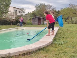 Bevor wir ein Brathähnchen und Salat einkaufen, spielen die Kinder noch auf dem einzigen Spielplatz in Mouries.