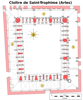 Die Abtei gliedert sich in die Bereiche der Basilika (1), des Klosters mit Dormitorium (1. Etage), Kreuzgang (2), Refektorium (6) und Kapitelsaal (3), der Wirtschaftsgebäude und der klösterlichen Gärten.
