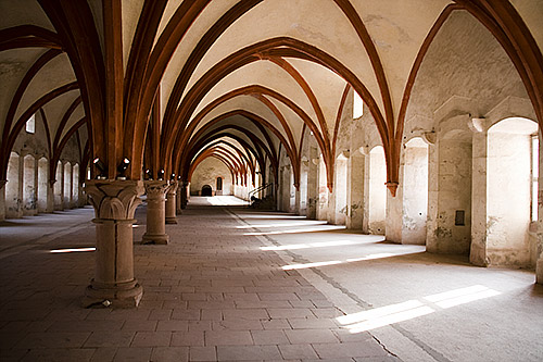 Aber eine Fensterzone fehlt, die Beleuchtung erfolgt durch die Seitenschiffe und die dichten Fenstergruppen an der Eingangswand, an den Chorwänden und an den Querschiffenden. Das Innere blieb entweder steinsichtig oder wurde verputzt und mit weißen Fugen bemalt, der einzigen zulässigen Farbe – auch die Gewänder der Zisterzienser waren farblos. Sonst erhielt der turmlose Bau weder plastischen noch malerischen Schmuck.