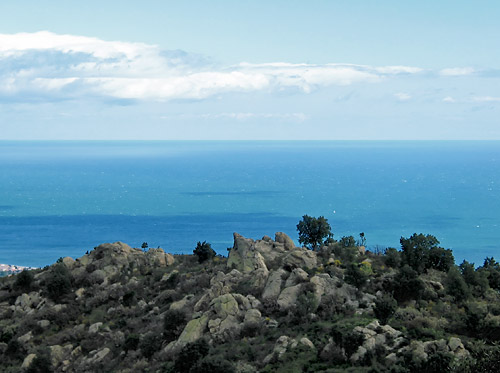 Ab hier folgt man der gelben Wegmarkierung hinauf zunächst Richtung Tour de la Massane. Am Wegweiser auf einem Sattel zweigt der Weg ab. Rechts geht’s Richtung Tour de la Massane, wir gehen geradeaus weiter zur Chapelle St. Lorenc (beim letzten Besuch 2009 fehlte jeglicher Hinweis zur Kapelle! Wegeführung hat sich u.U. geändert – es gibt aber nur die Alternative geradeaus).
