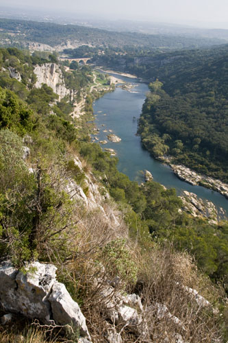 Hinab geht es direkt gegenüber der Einmündung des großen Weges, auf dem wir hierhin gekommen sind. Ein leicht zu übersehender kleiner Weg führt hinunter auf einen breiten Forstweg. Hier biegen wir links ab und wandern zwischen mit Korkeichen bewachsenen Ziegenweiden weiter bis zur nächsten Abzweigung. Hier rechts hinunter, vorbei an einem Campingplatz. Unten überqueren wir die Massane und gelangen wieder zurück auf die Straße, wo wir nach rechts abbiegen und Bois fleuri erreichen.