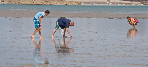 Nach ein wenig Muße (in der Sonne ist es südländisch warm) gehen wir hinunter zum Hausstrand, laufen ein wenig am bei Ebbe nun riesengroßen Strand entlang und legen uns in die Sonne bis uns der auffrischende Wind verjagt.
