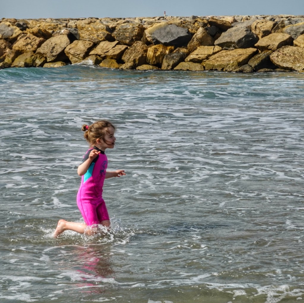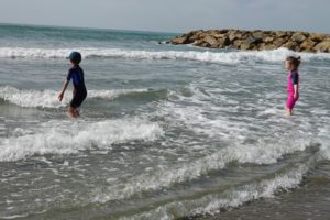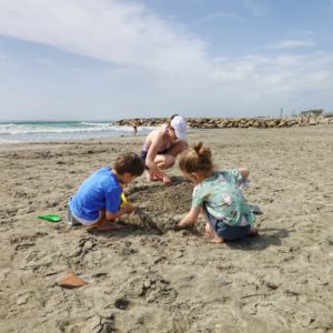 Wir machen uns am Strand breit und die Kinder sind gleich mit Neopren im ziemlich kalten Wasser.