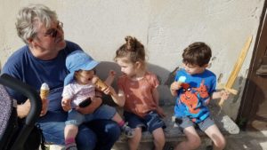 Während Oma und Opa auf die Sachen aufpassen, gehen die anderen Eis essen.