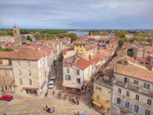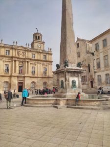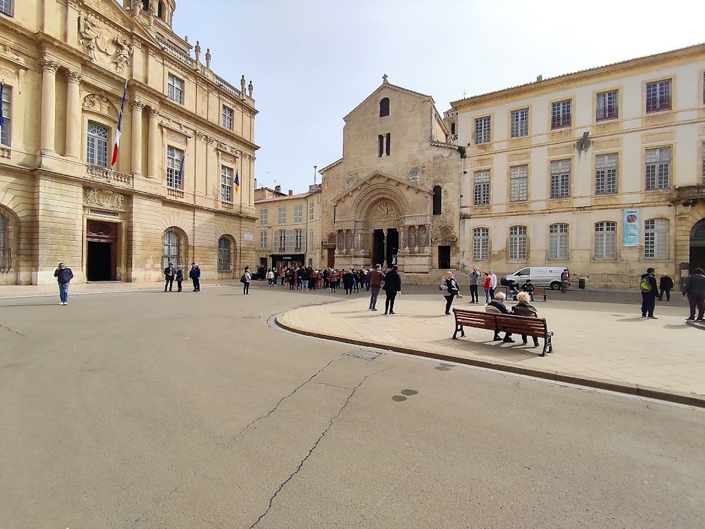 Durch die engen Gassen laufen wir zu Saint Trophime und machen Pause auf der Place de la Republique vor dem Rathaus.