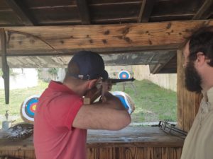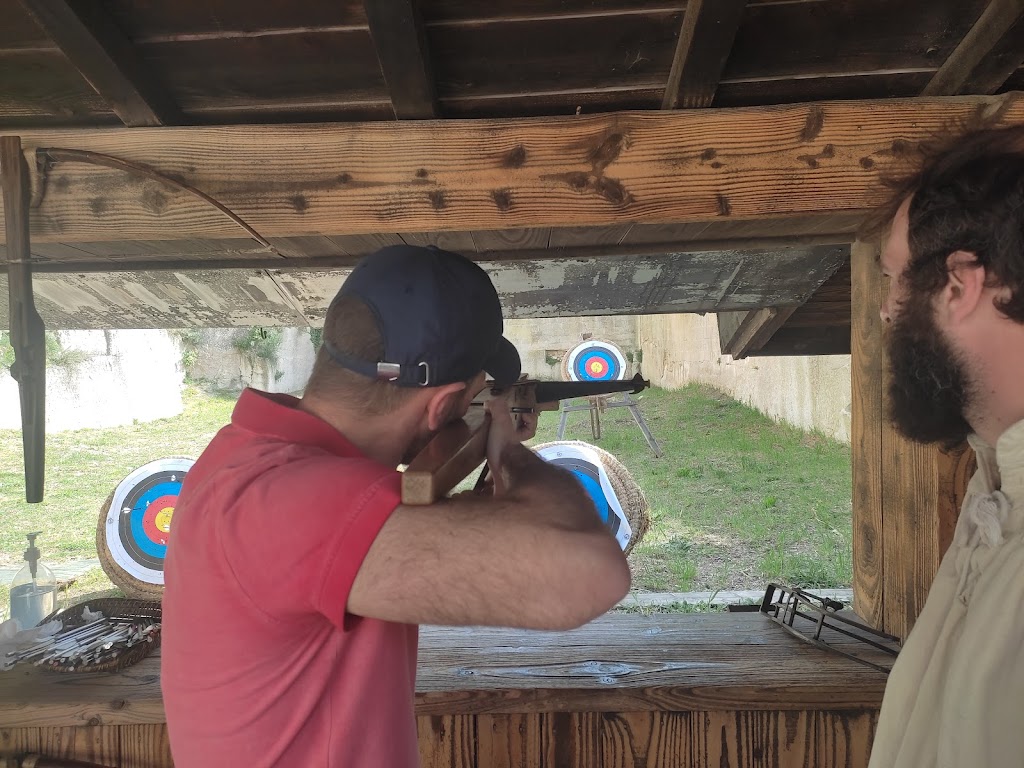 Es gibt jetzt regelmäßige Vorführungen am Katapult und David und Mio dürfen mit der Armbrust schießen.