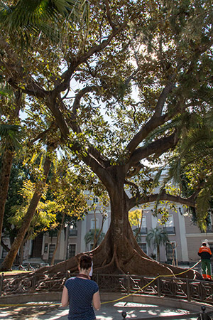 Wir laufen über das Universitätsgelände zum Parque de Maria Luisa und weiter zur Plaza de Espagna mit dem halbkreisförmigen „Gebäude“ (200 m Durchmesser), das anlässlich der iberoamerikanischen Ausstellung im Jahr 1929 errichtet wurde – grandios und heiß! Ein wenig Ausruhen im Schatten muss jetzt sein.