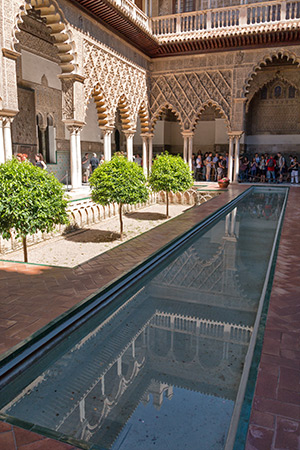 Eine sehr lange Schlange wartender Touristen steht in der prallen Sonne – die Kathedrale besichtigen wir beim nächsten Mal. Stattdessen reihen wir uns vor dem Real Alcazar ein. Vor der Kasse aufwändige Sicherheitsmaßnahmen – es geht aber recht zügig voran.