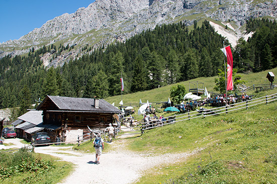 10.10 Uhr Abmarsch. Es geht durch lichten Wald, über Wiesen , zunächst ein wenig auf und ab, vorbei an Wasserfällen – im Blick immer die steilen Wiesen und Höfe auf der anderen Seite des Schnalsbachs.
