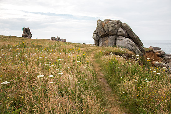 Nach der Besichtigung starten wir unsere Rundwanderung von Kernelehen aus über den GR 34 zunächst zur Pointe de Barnenez, wo die Île de Stérec wie Lummerland vor uns liegt.