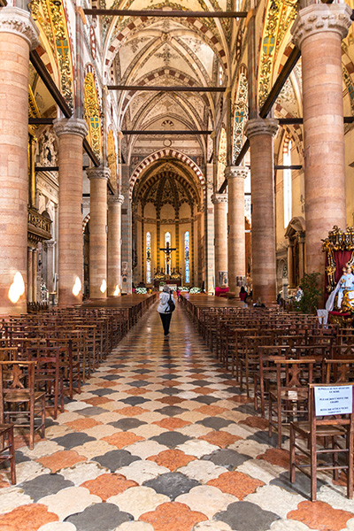 Der erhöhte Chor zeigt als Folge eines Umbaus zum Ende des 14. Jahrhunderts gotische Stilelemente. Er beherbergt ein berühmtes Altarbild, das als Triptychon von Mantegna bekannt geworden ist.