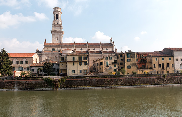Die Basilika San Zeno Maggiore ist ein romanischer Bau aus dem 12./13. Jahrhundert. Der Wehrturm der Abtei und der freistehende Turm der Basilika bilden einen schönen Rahmen für die Fassade der Kirche.