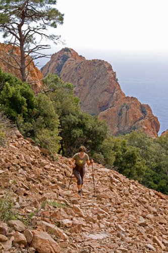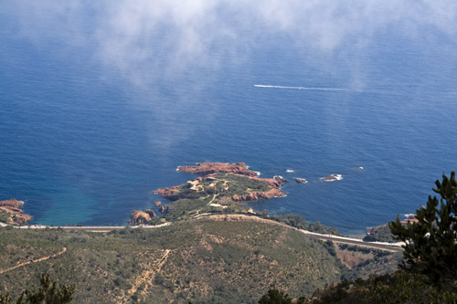 Wir laufen durch die Anlage hinunter zum Meer und am Ufer entlang Richtung Cap du Dramont: Vorbei an Tiki-Plage hinauf Richtung Leuchtturm und weiter zum Port du Pussai, wo wir in der Sonne sitzen, Bier und Kaffee trinken oder Eis essen. Auf gleichem Weg bei tollem Licht mit blauem Himmel, weißer Gischt und roten Felsen geht es zurück.
