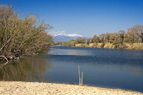 Unterwegs immer wieder sehr schöne Ausblicke auf den schneebedeckten Canigou und mit dem Schilf des Naturschutzgebietes Mas Larrieu im Vordergrund stelle ich mir vor, ich sei in der afrikanischen Steppe mit Blick auf den Kilimanscharo.