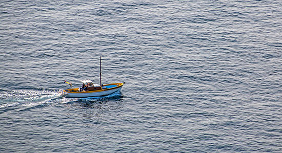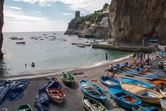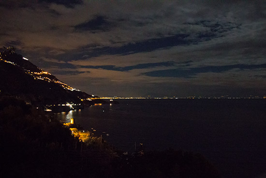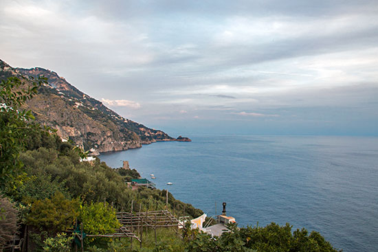 An einem Bauernhaus warten wir und lassen alle passieren. Schnell haben wir sie aber wieder eingeholt. Unter einer Felswand machen wir deshalb unsere Mittagspause, lassen uns Zeit und die Gruppe weit vorausgehen, setzen uns in die „Aussichtskanzel“ und genießen den Blick auf Positano und die Küste bis nach Capri, das leider im Dunst nur zu erahnen ist.