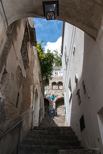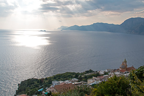 Um 9.15 Uhr brechen wir auf. Zunächst über Treppen steil hinauf zur Via Constantinopolo oben in Praiano, dann weiter Richtung Colle La Serra und Bomerano. Der Weg ist durchgängig markiert und gut begehbar, teilweise geht es über Stufen, aber auch ein wenig durch Wald mit Schatten. Wir sind froh, dass es beim anstrengenden Aufstieg noch bedeckt ist, mächtig ins Schwitzen geraten wir trotzdem.