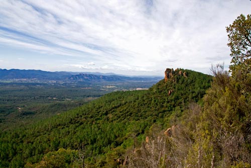 Der gelb-markierte Abzweig lässt aber auf sich warten und es ist viel weiter als wir gedacht haben. Heute ist alles besser markiert und der Weg durch den Korkeichenwald bis zum Steilhang breit geräumt. Hinter der Ruine geht es zunächst über glatte Felsplatten hinauf, dann folgt steiles Blockklettern bis zu einer ausgesetzten Stelle, um die man herumkommen muss. Früher ist uns das Ganze irgendwie leichter vorgekommen. Jedenfalls strengte der Aufstieg ziemlich an und oben waren wir nass geschwitzt, auch ohne Sonne.